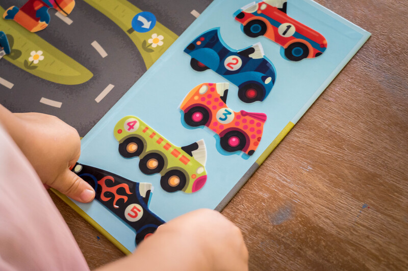 These reusable stickers come in a folder with gorgeous illustrations of a race track that toddlers and preschoolers can decorate with repositionable thick car stickers.