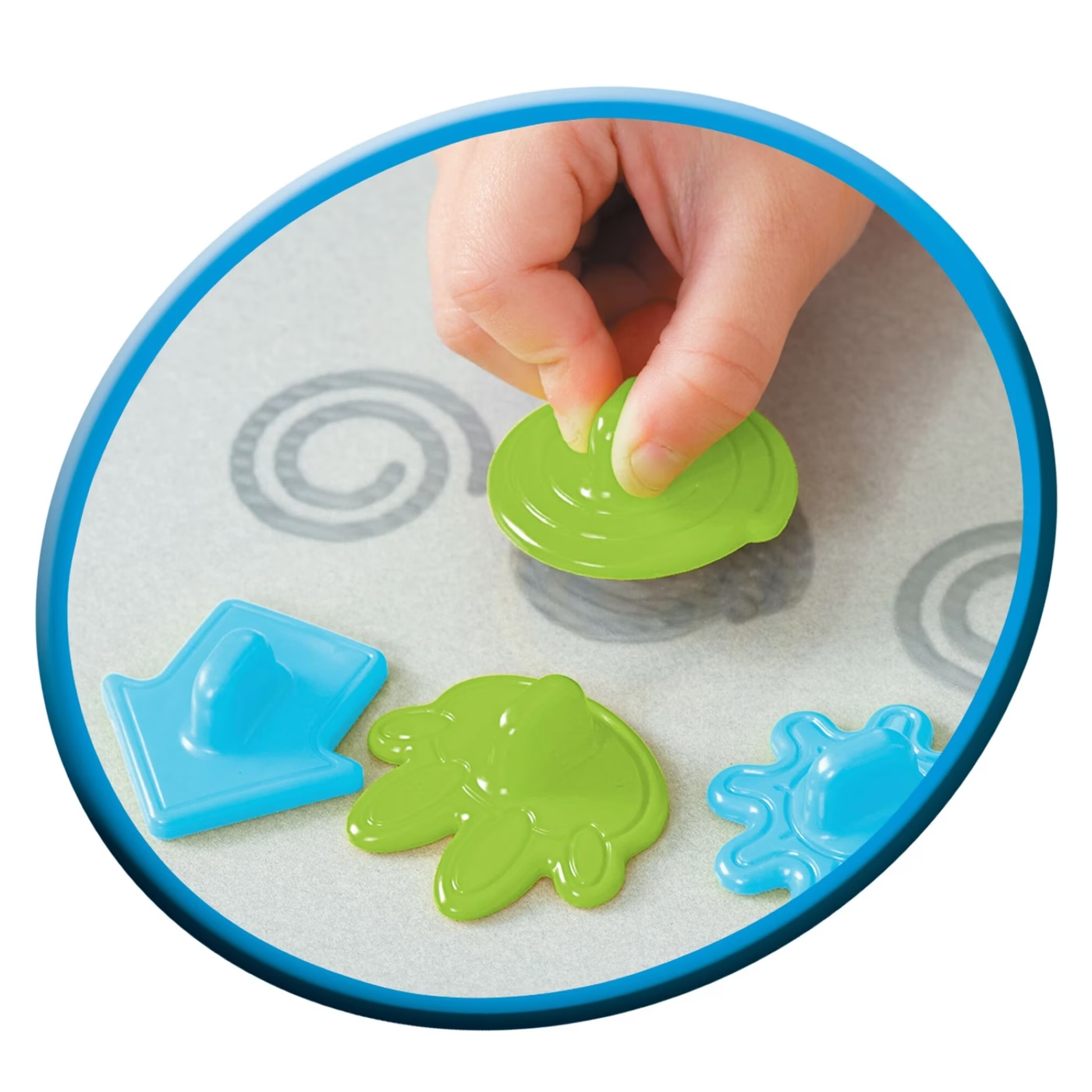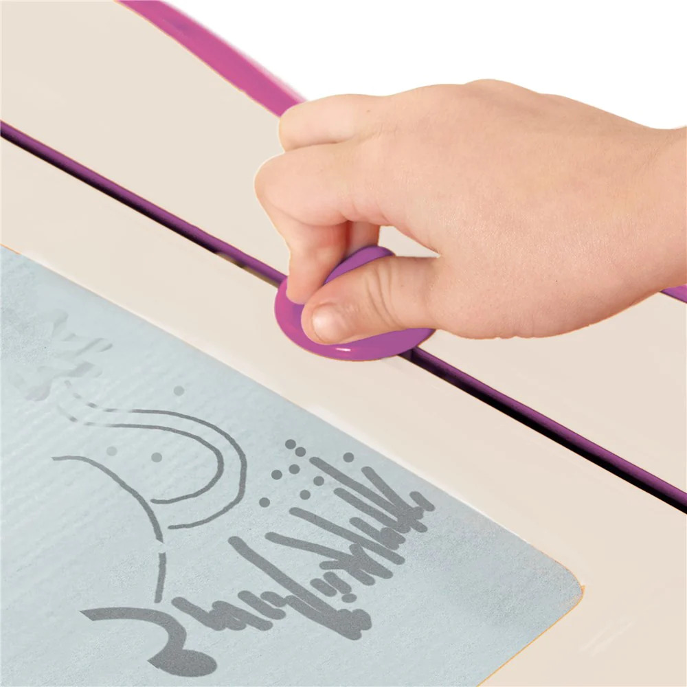 The magnetised board, magic pen and 4 stamps encourage creative drawing which can be easily refreshed by pulling the eraser button up and down.