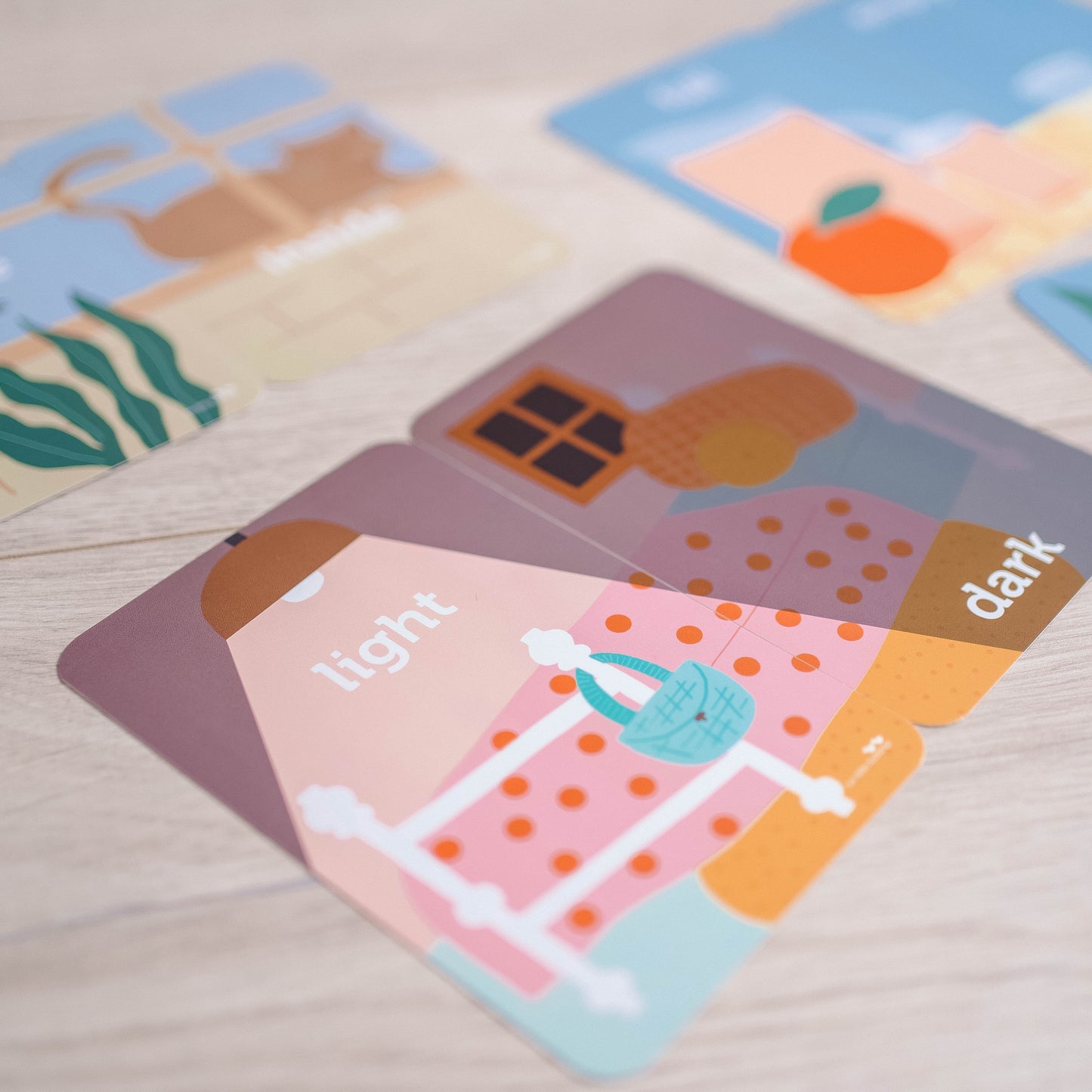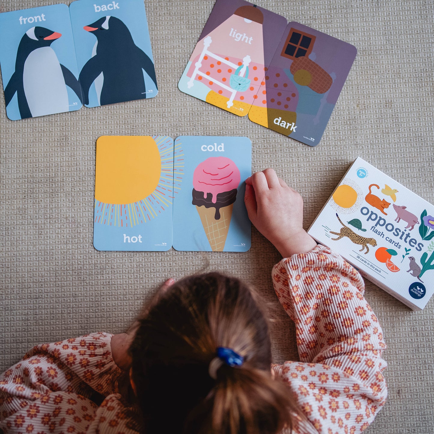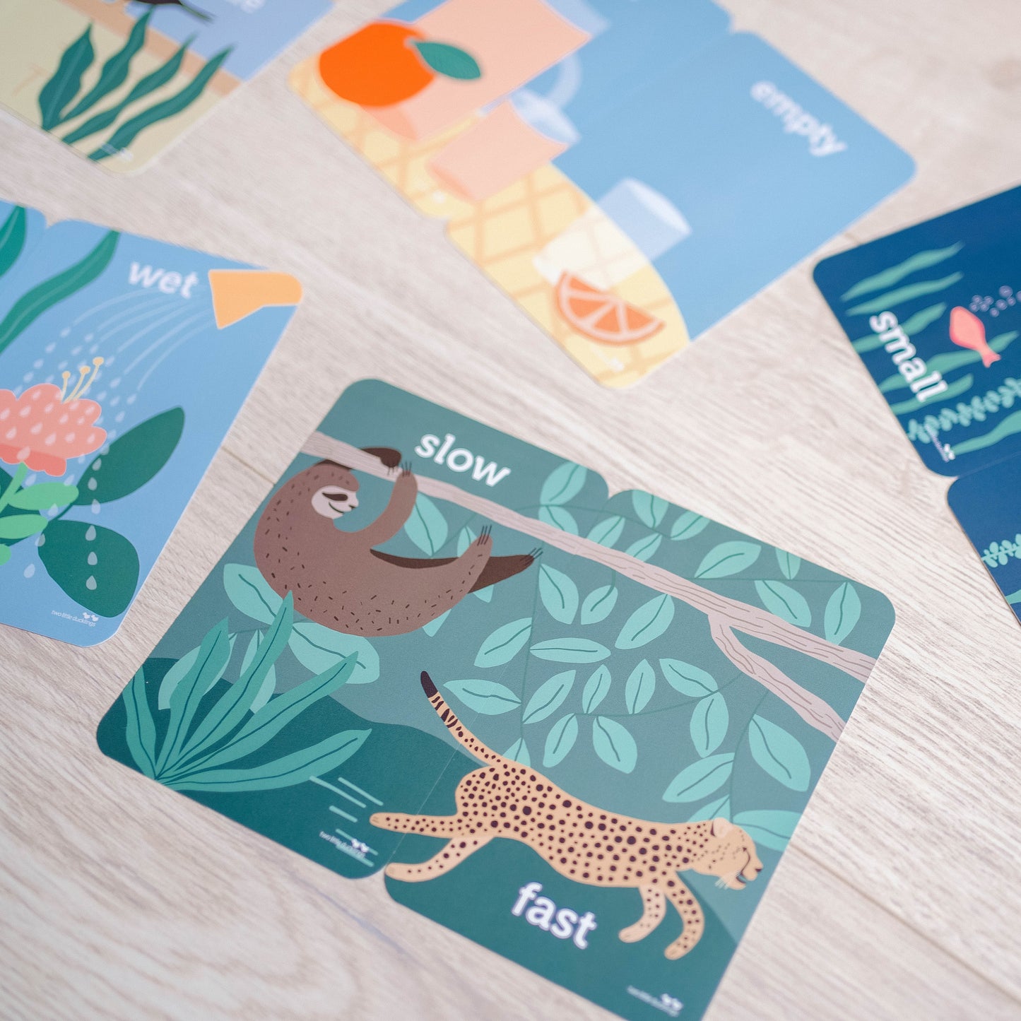 Make learning opposites fun with this set of brightly-coloured illustrated flash cards.