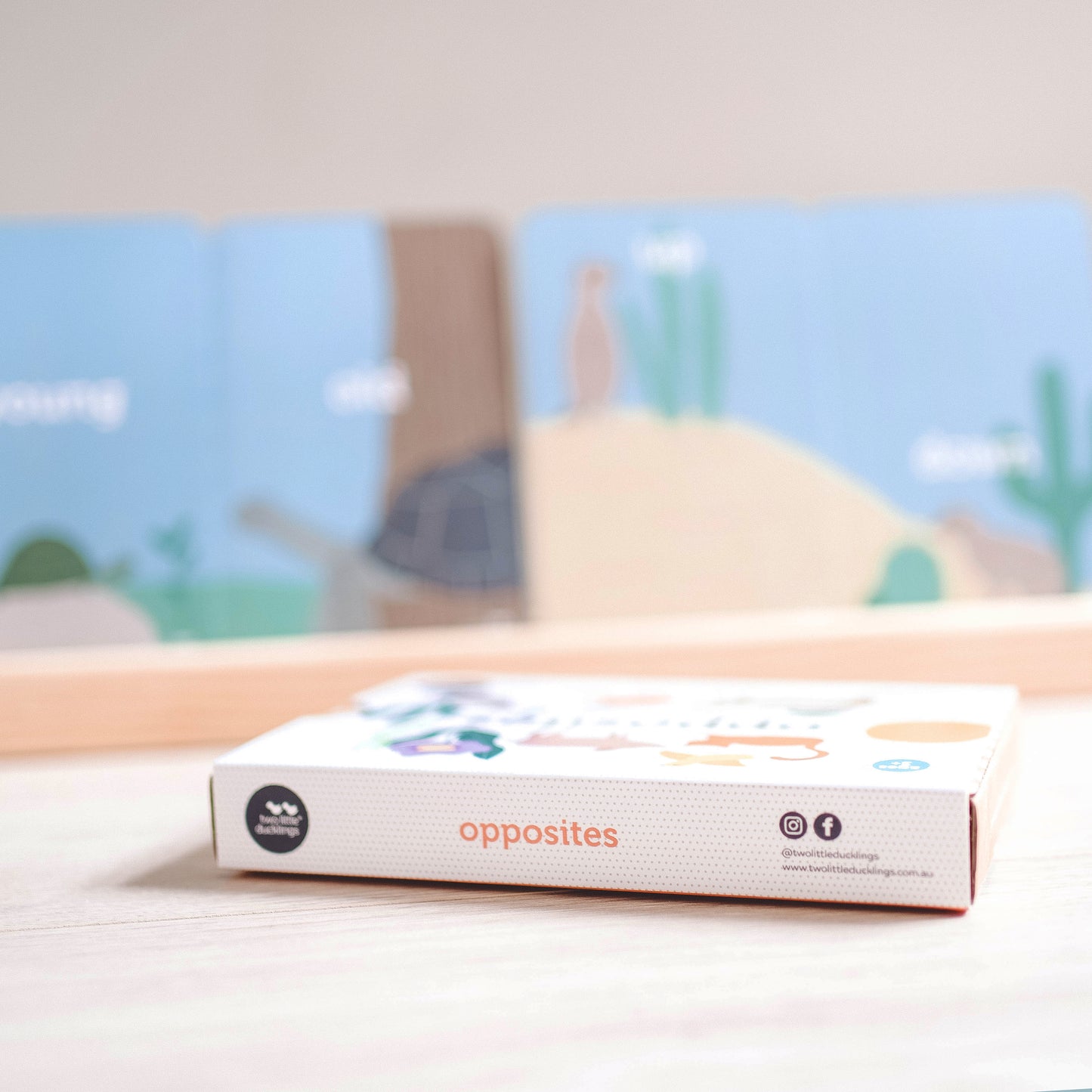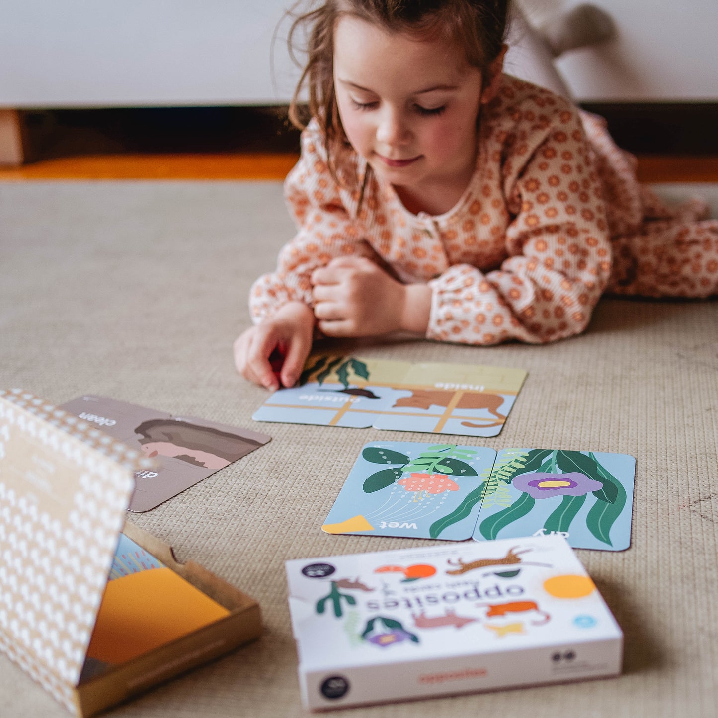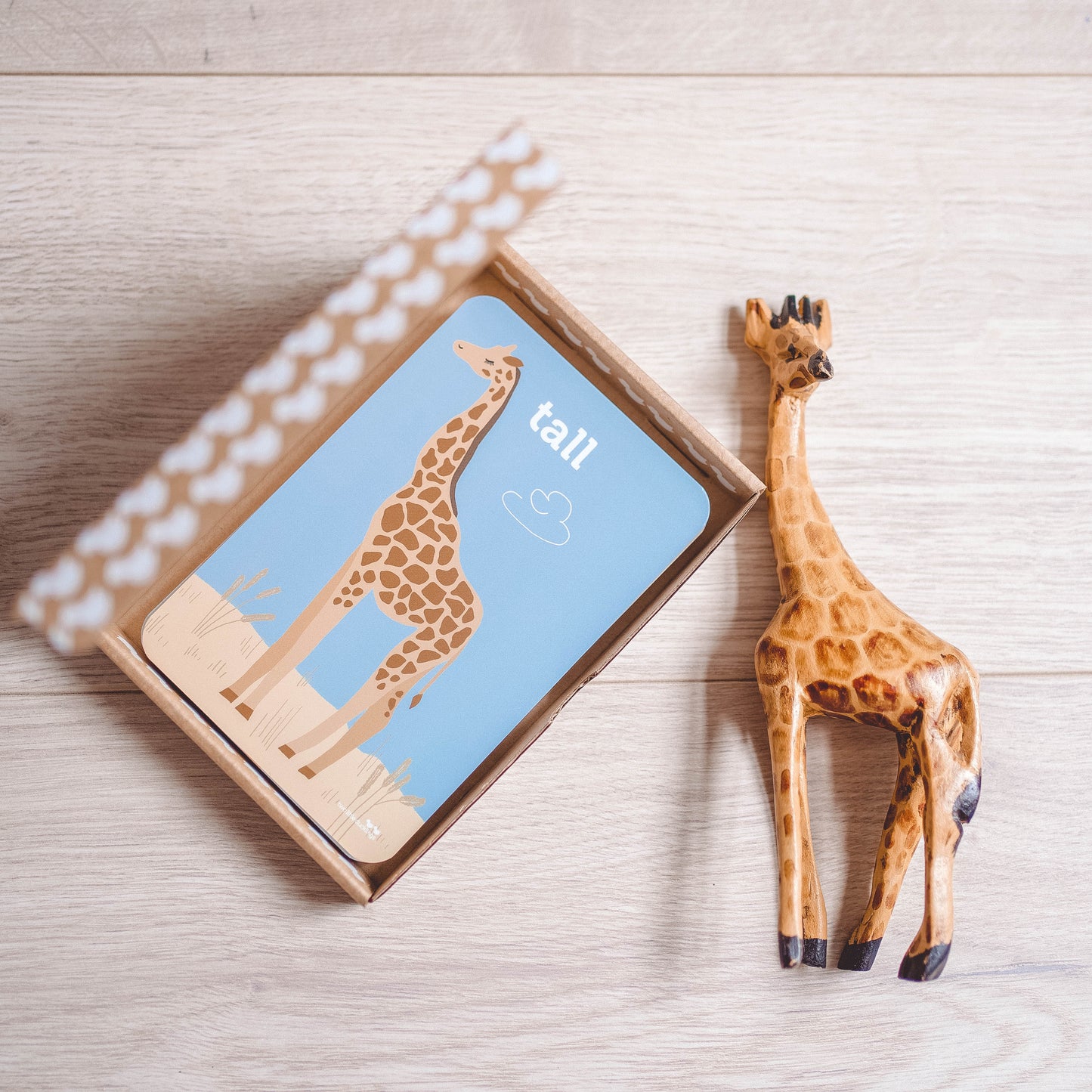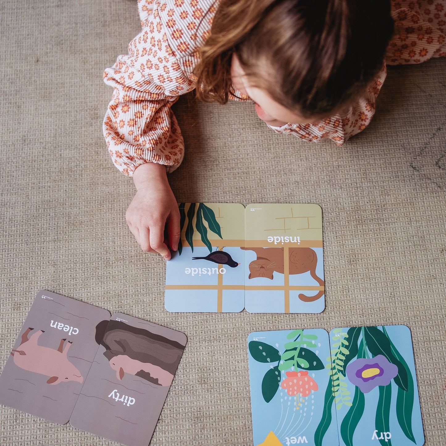 Make learning opposites fun with this set of brightly-coloured illustrated flash cards.
