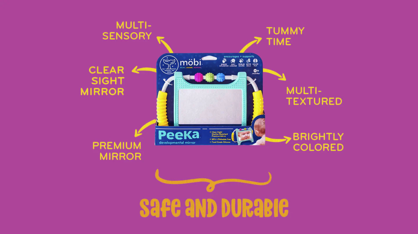 Peeka can lay flat or upright. It is the perfect tummy time mirror but can also be easily transported in a purse or diaper bag due to its compact size.