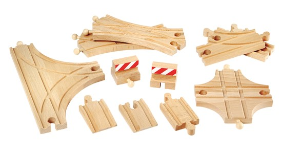 Expand the BRIO wooden railway system in all new directions with this multi functional advanced expansion pack of switches and accessories.
