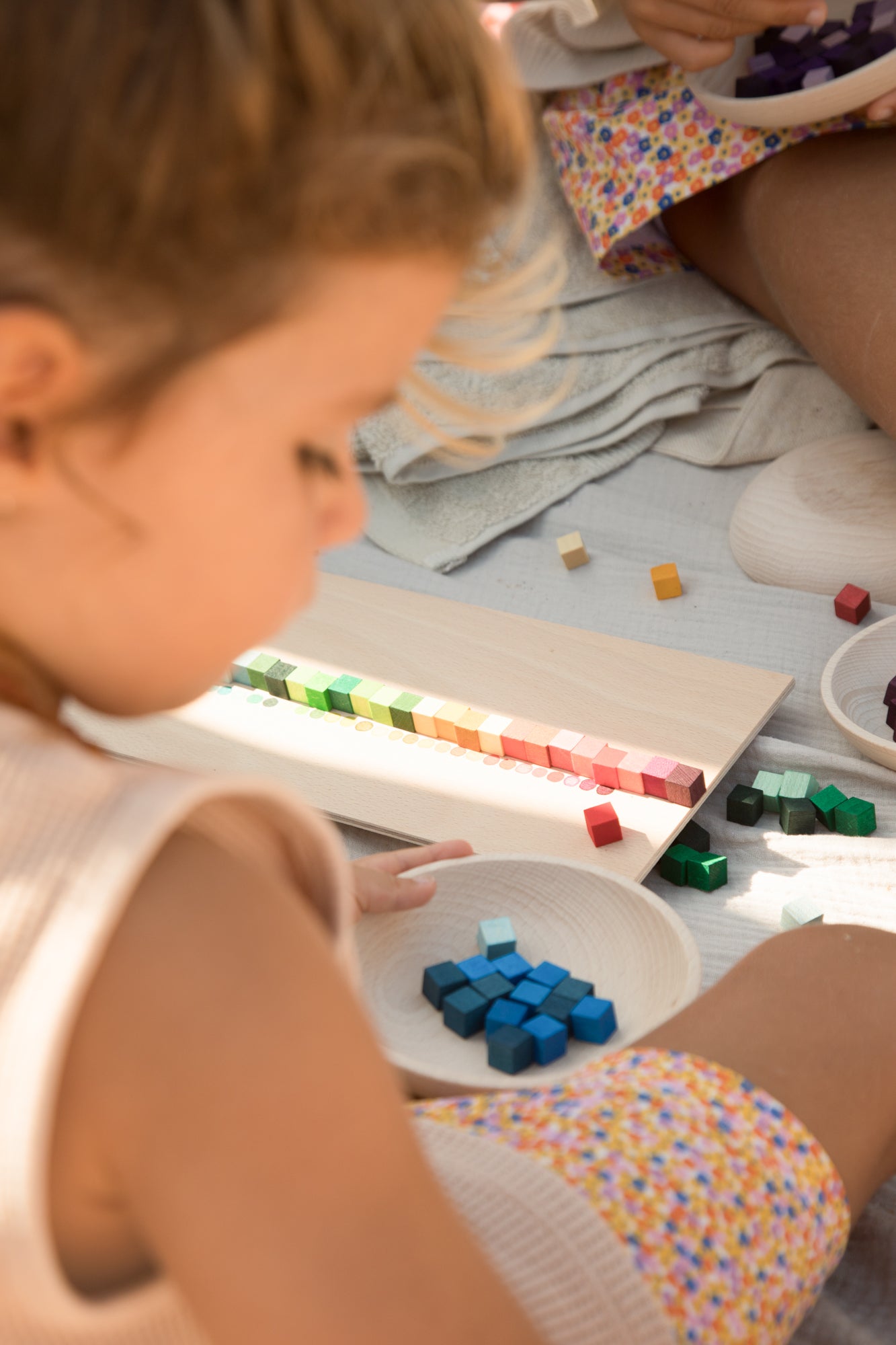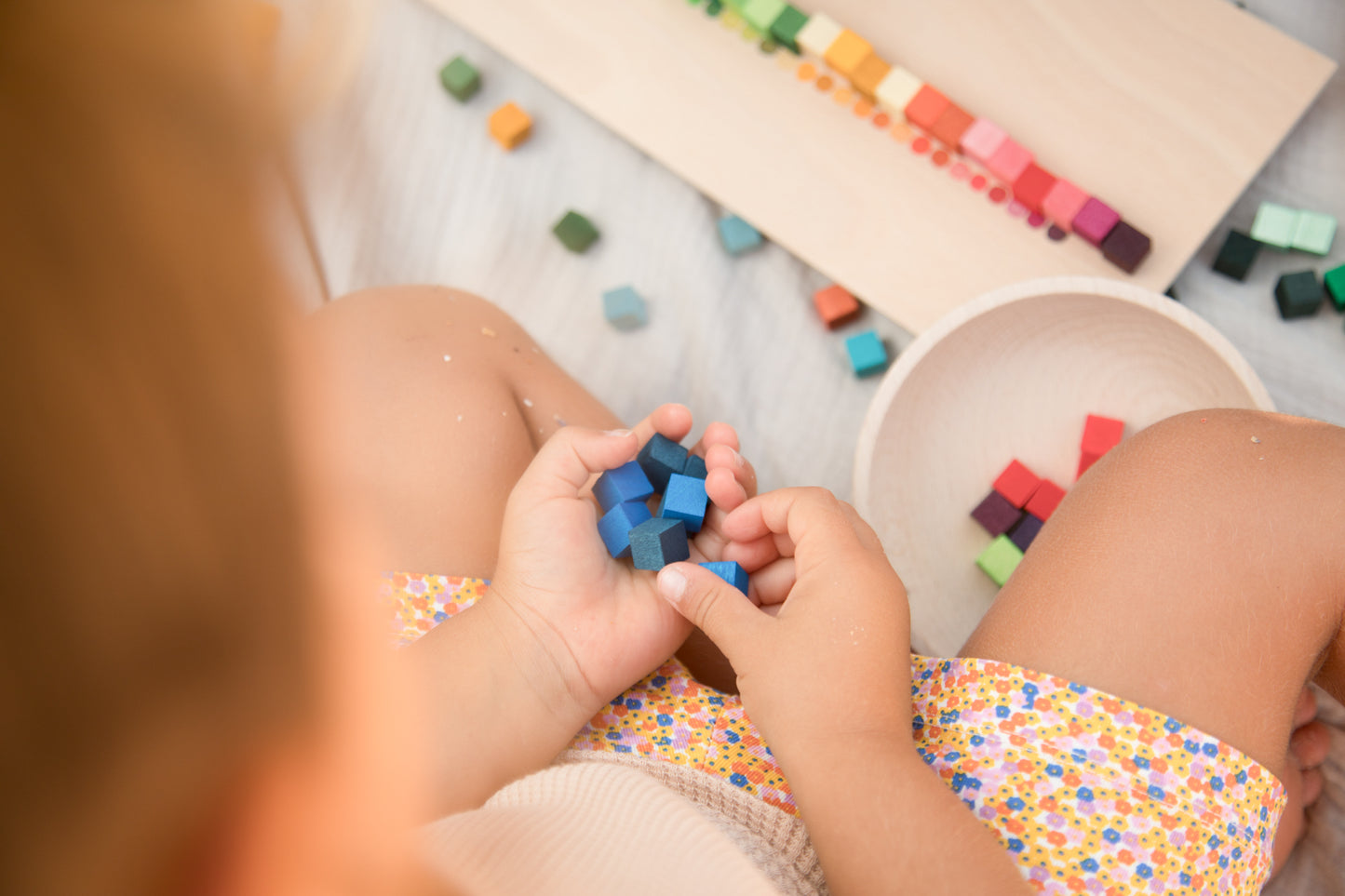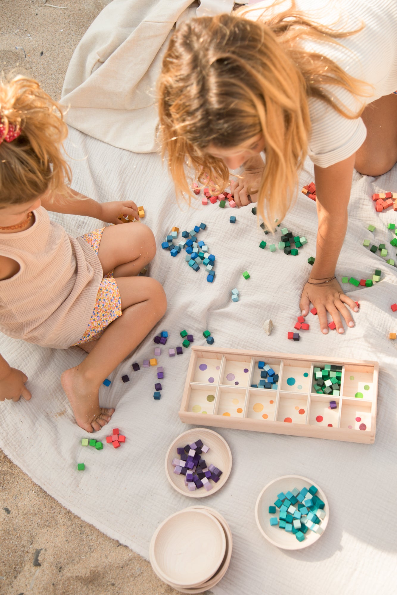 Mis and Match is a collection of colourful cubes in a wooden sorting box. The cubes