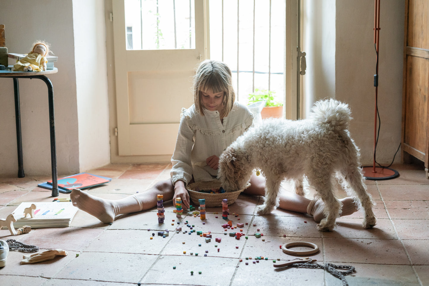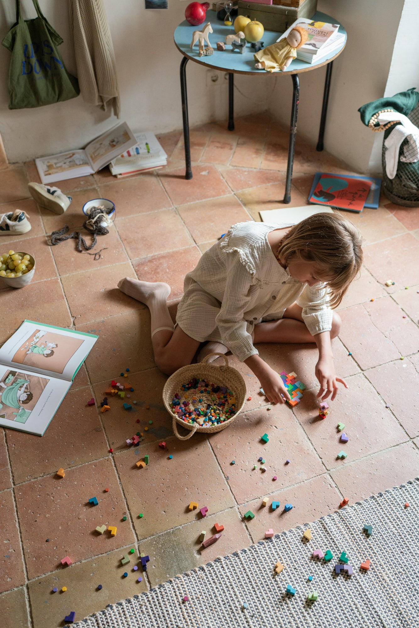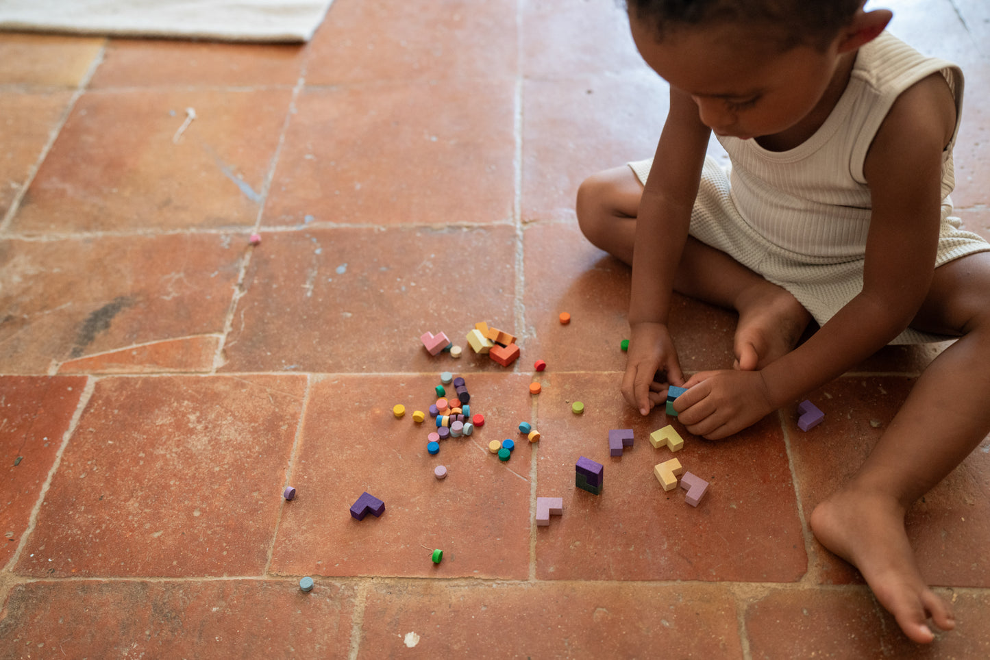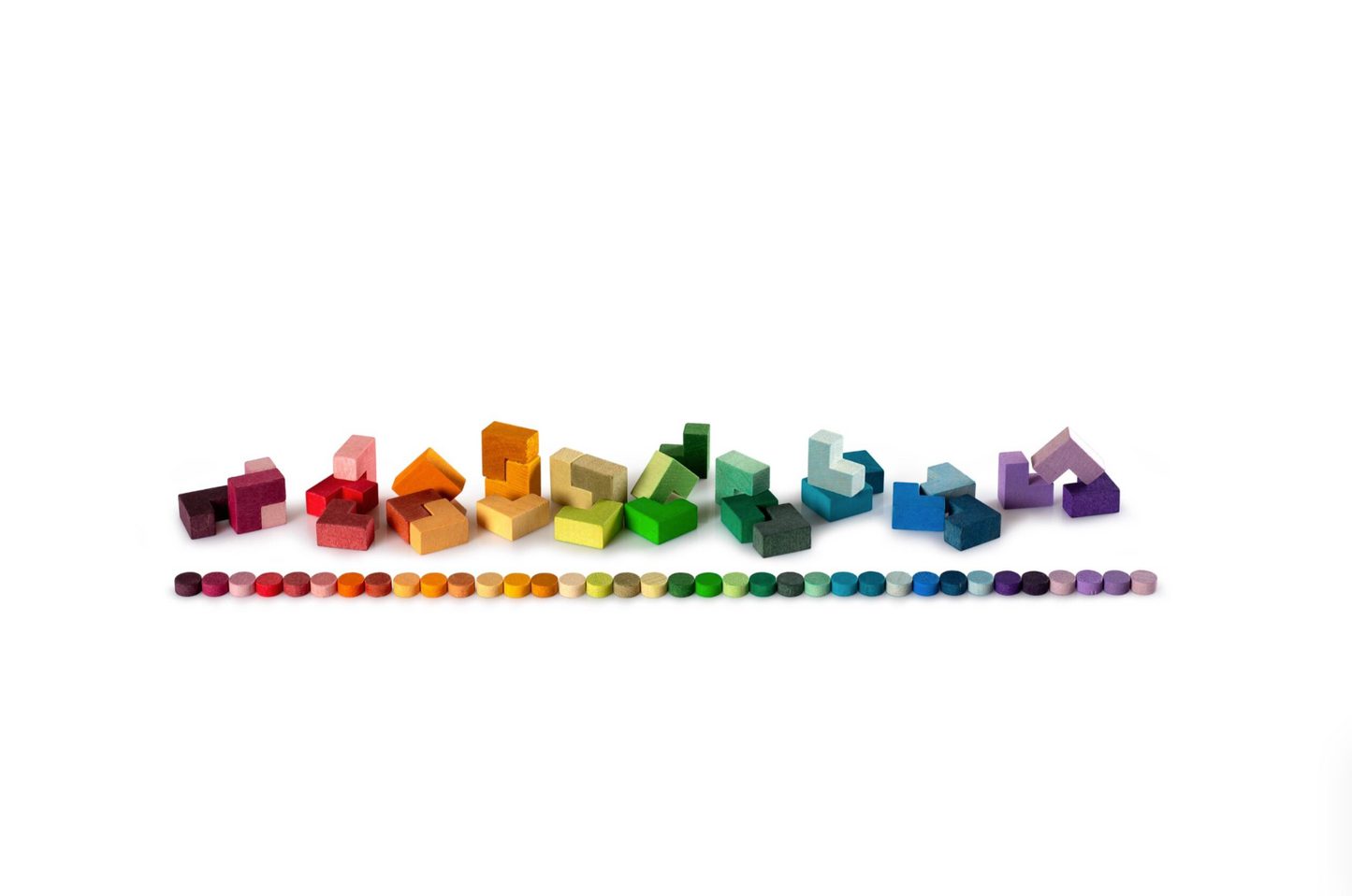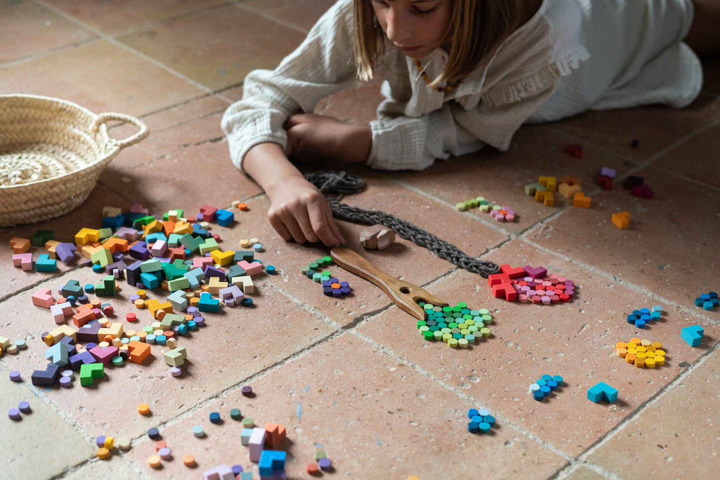 Bloom is a colourful collection of wooden dots and L Shaped wooden forms. It can be used to create freely, for mosaics or to experience geometrical concepts. It completes Grapat's “Mis & Match set”, by adding richness to your creations.