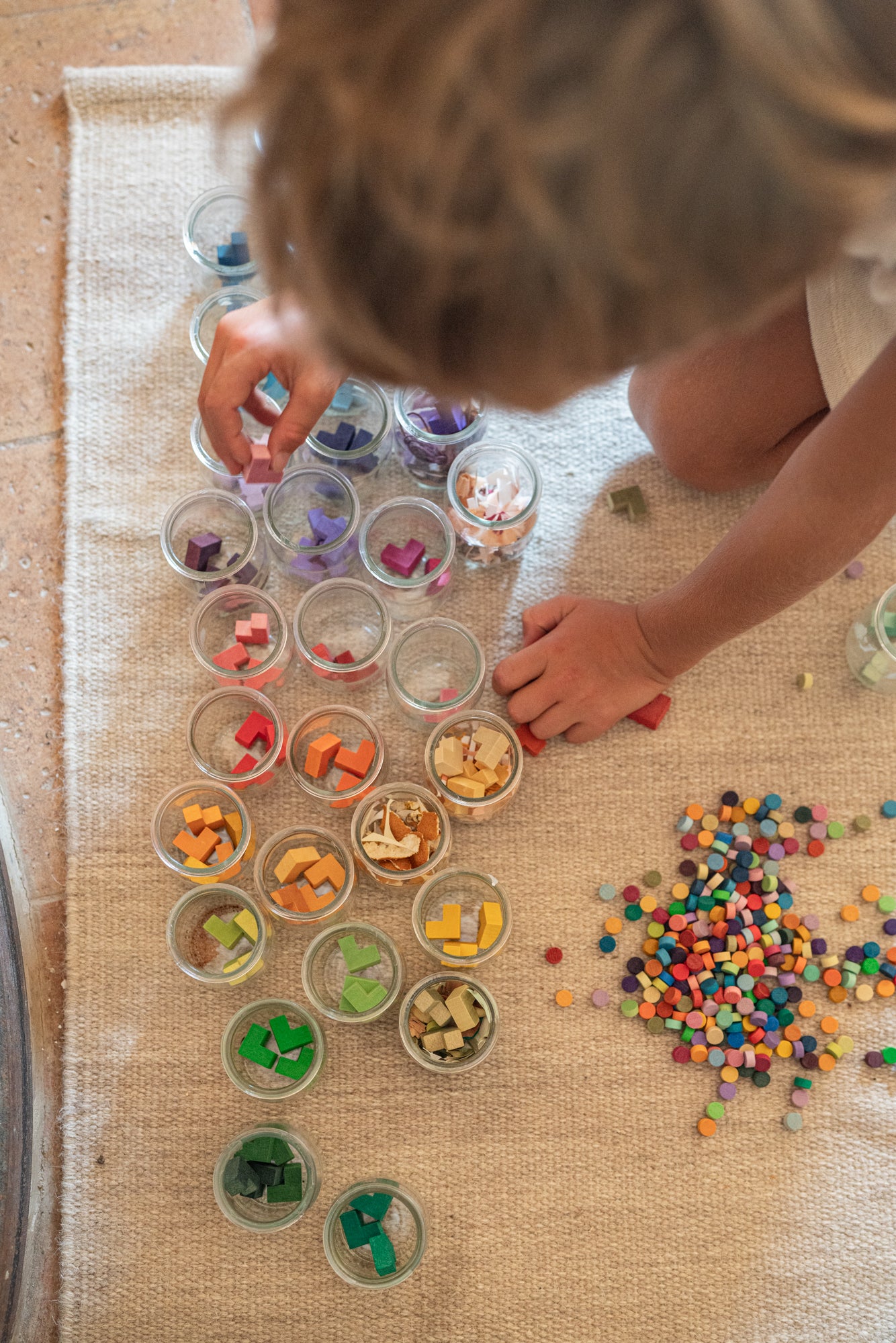 Contains over 400 small wooden pieces in two shapes, the dots are 10mm ø and the L 20mm x 20mm / 36 gradient colours of the rainbow. Bloom comes in a GOTS certified cotton bag (customers can add the Bloom pieces to their existing Mis & Match wooden storage box).