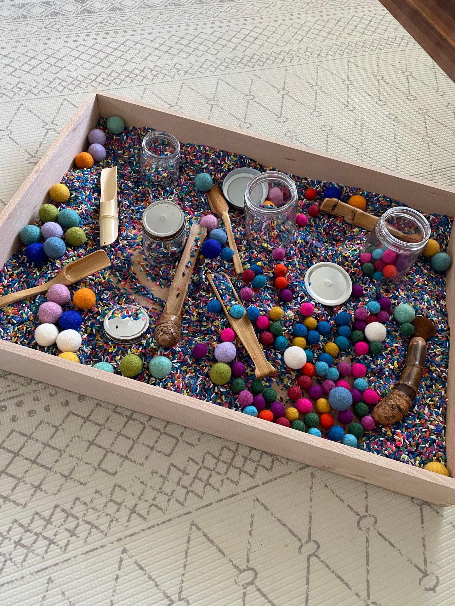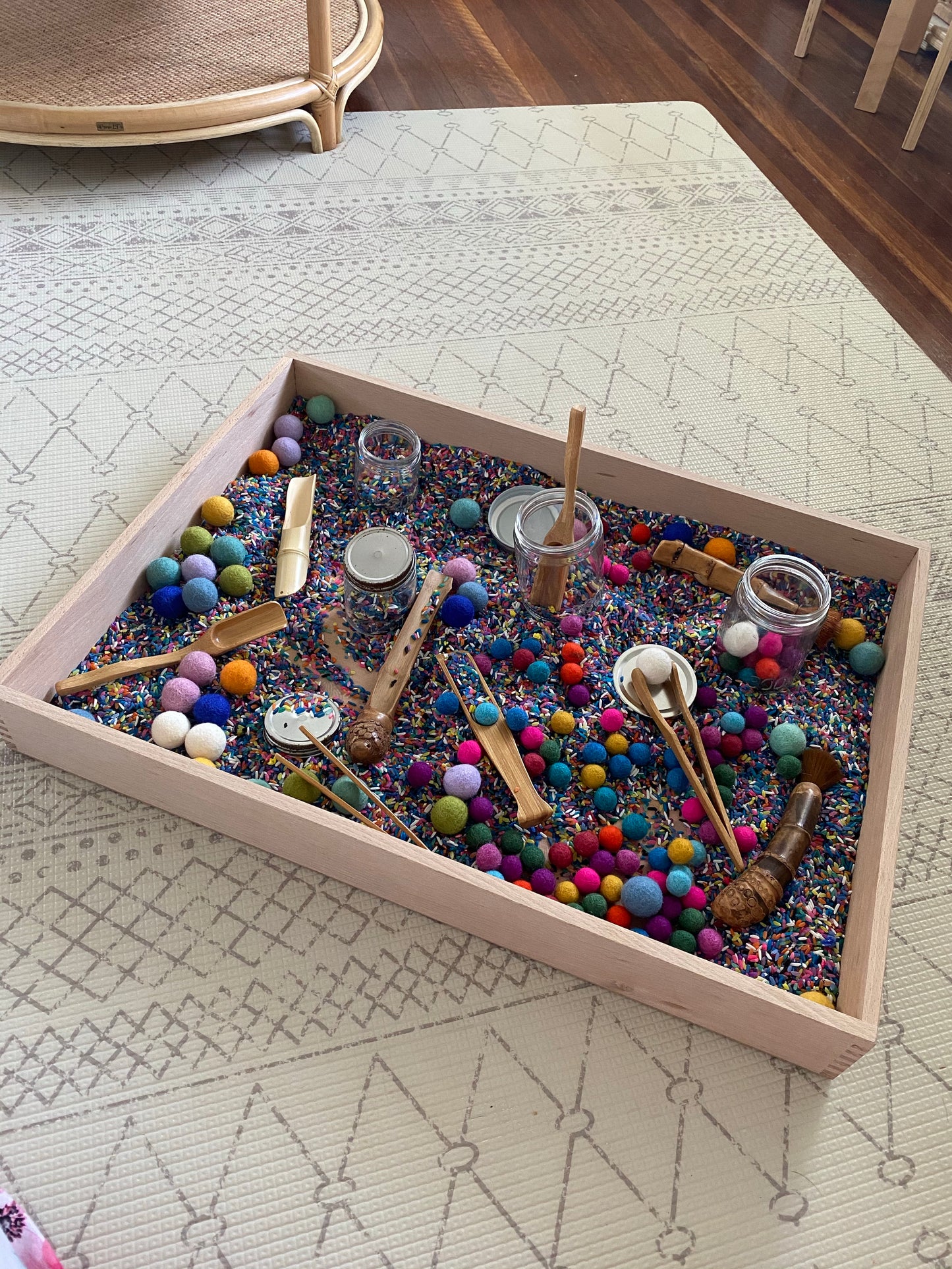 The Grapat Natural Free Play Box can be used to contain games, make small worlds or set up dry sensory play with Rainbow rice and some scoops.
