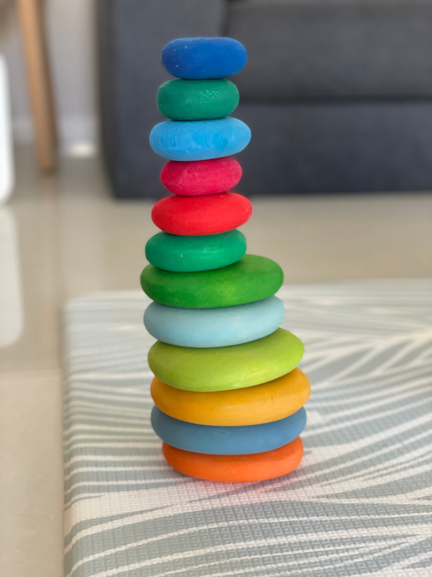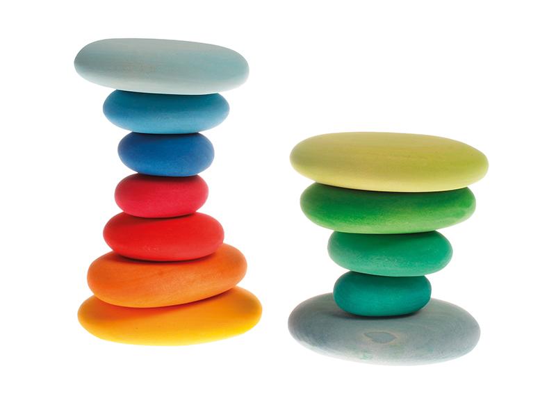 The Grimm's Pebbles are great for building, stacking and balancing with little hands. The smooth finish of the round pebble shapes is calming to touch and play. They are also perfect to add to small world play.