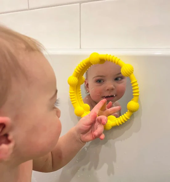 Lookee will turn bath time into a fun-filled learning adventure! The textured handles provide tactile stimulation and are safe for teething children. The mirror encourages eye contact and focus. Children can play, explore and delight in their own reflection.