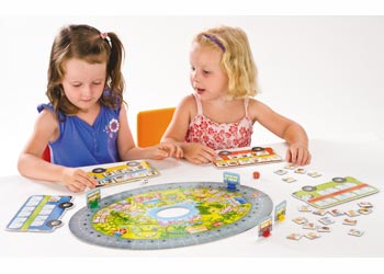 Contents: 1 x jigged playing board, 4 x bus boards, 4 x bus counters, 4 x stands, 40 x passenger cards, 1 x dice, 1 x spinner board, 1 x two-part spinner arrow, 1 x activity and instruction leaflet