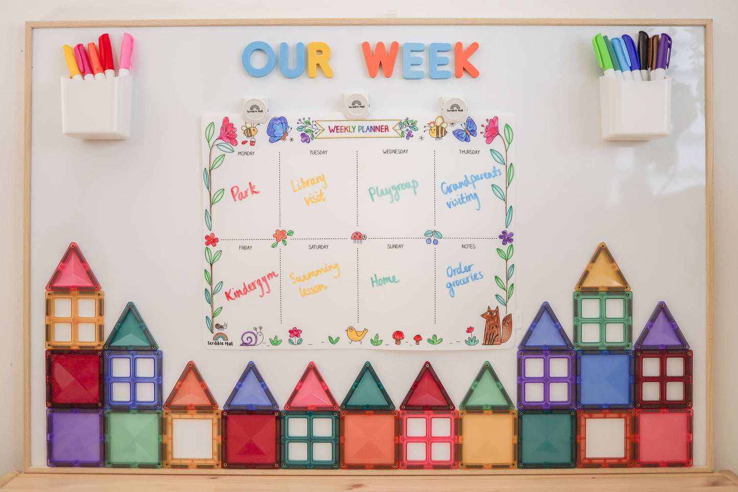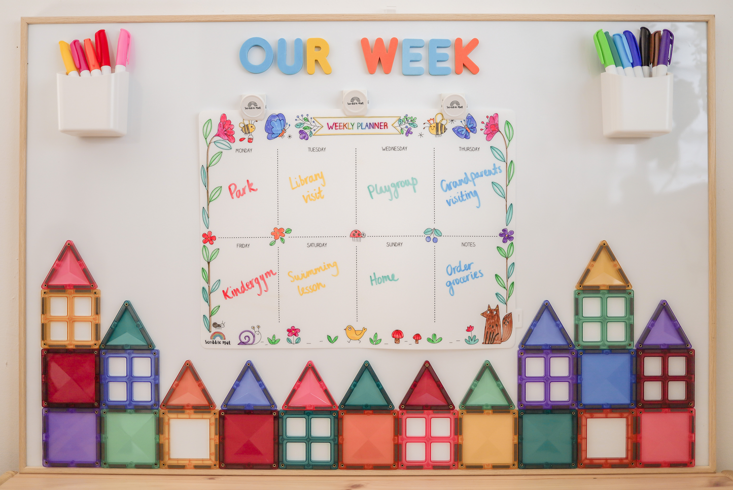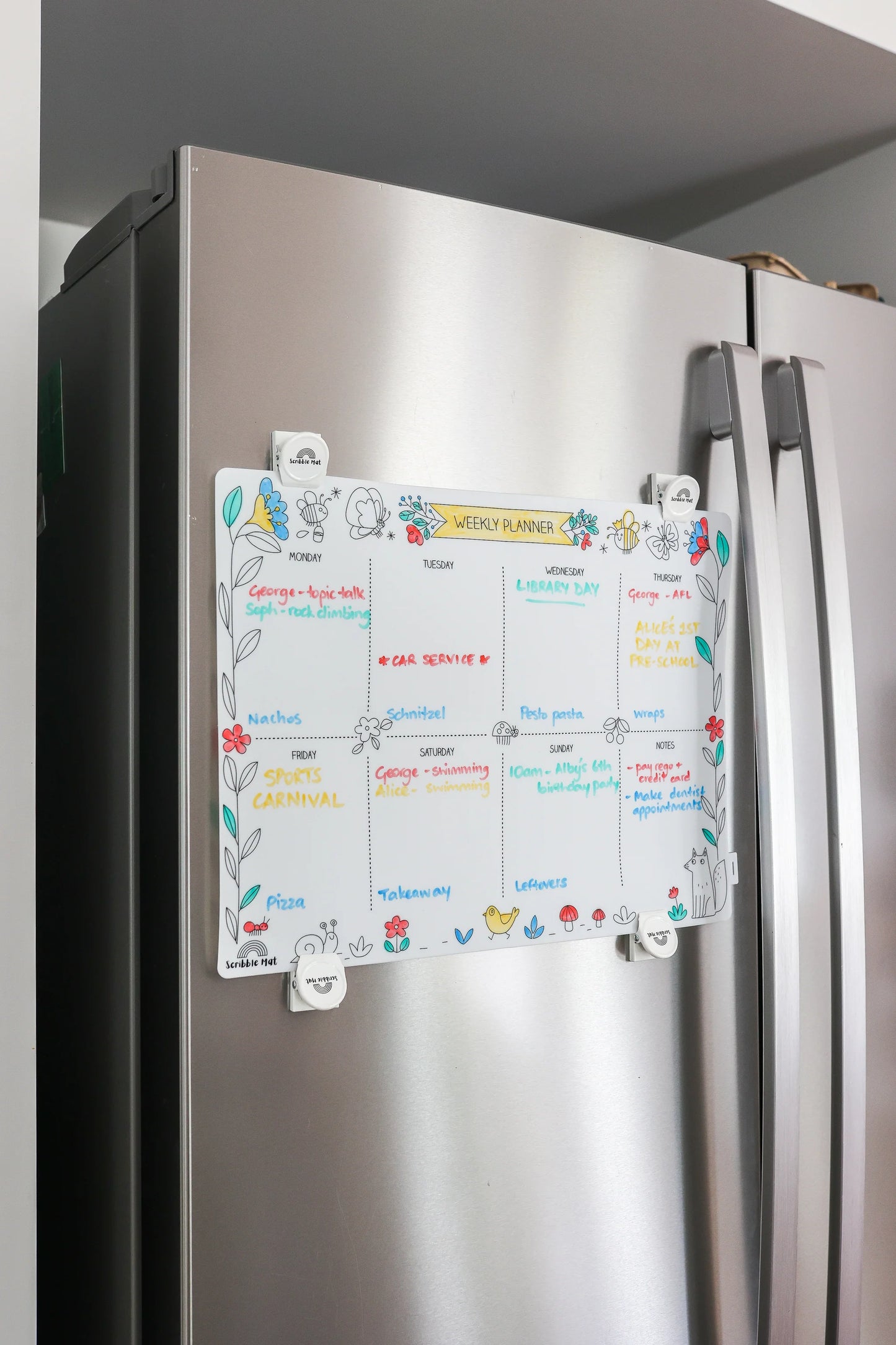 One reusable mat measuring 40x30cm, 4 magnets to add the mat to a fridge, cleaning cloth to wipe the mat clean, 4 pens (red, yellow, dark green, light blue) no pouch.