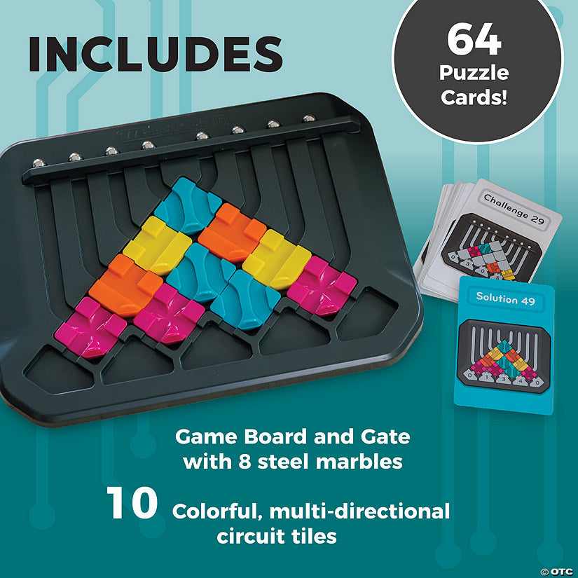 - Includes gameboard, 64 puzzle cards, 10 multi-directional tiles, 8 steel marbles and instructions.
