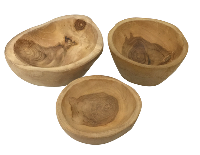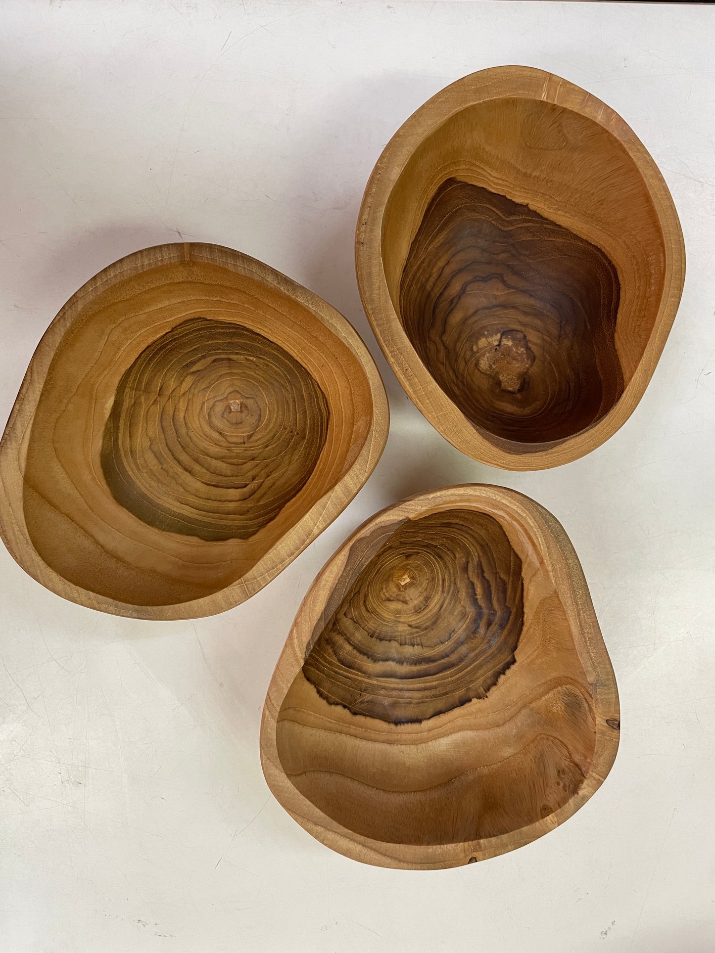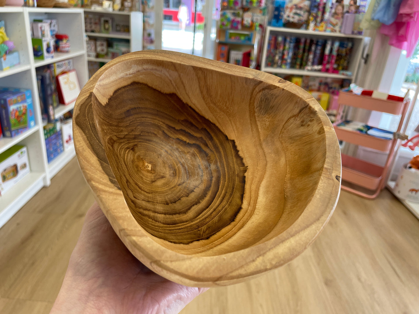 These wooden bowls are made from teak wood. They are unique and irregular shaped carved from one piece of wood and therefore aren't perfectly round. No two will ever be the same shape, size or marking.
