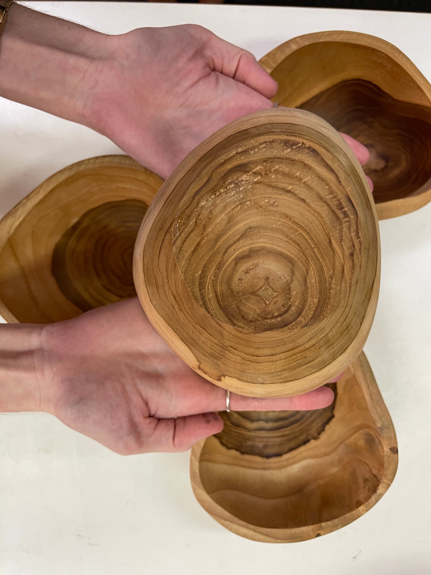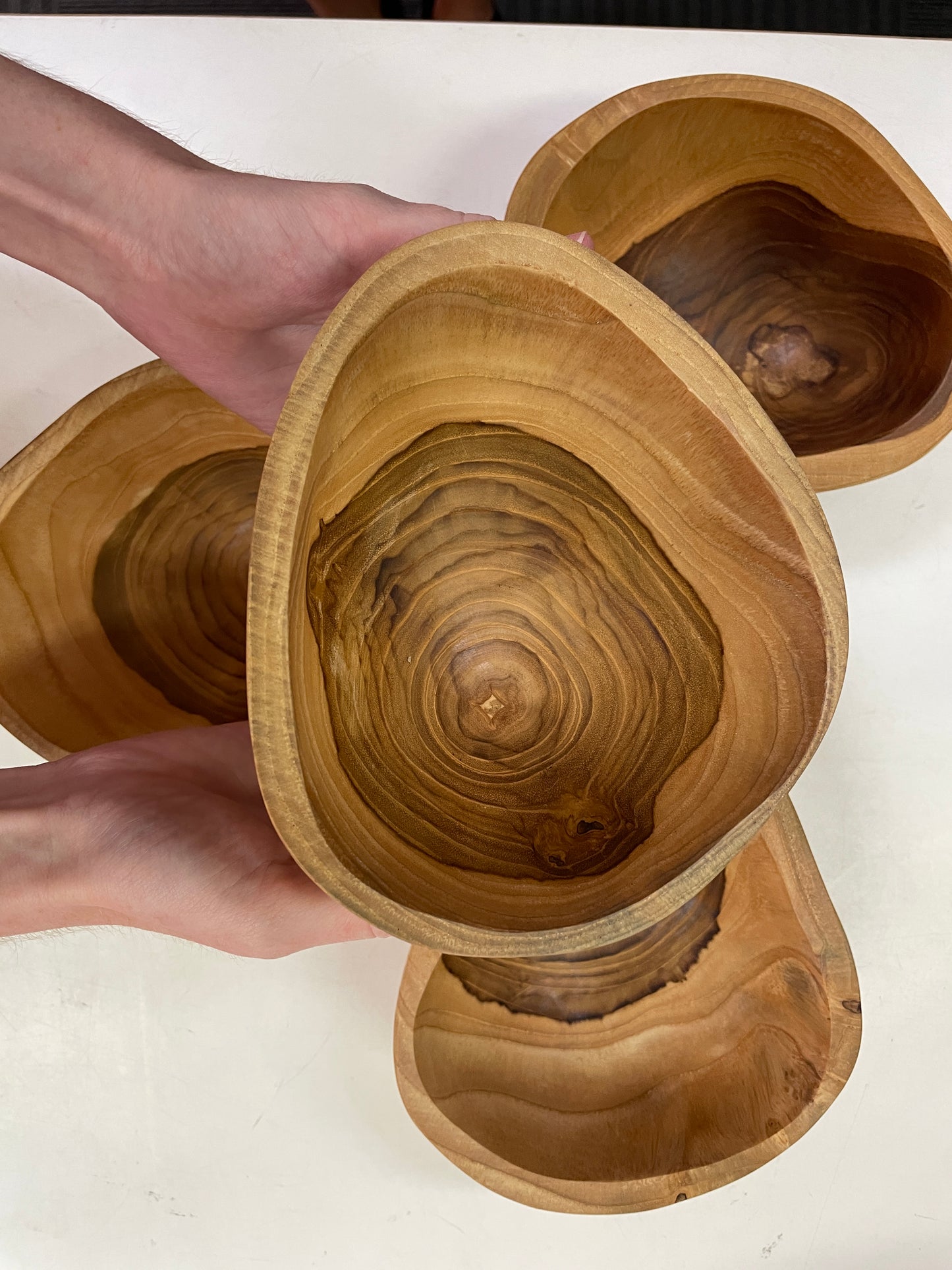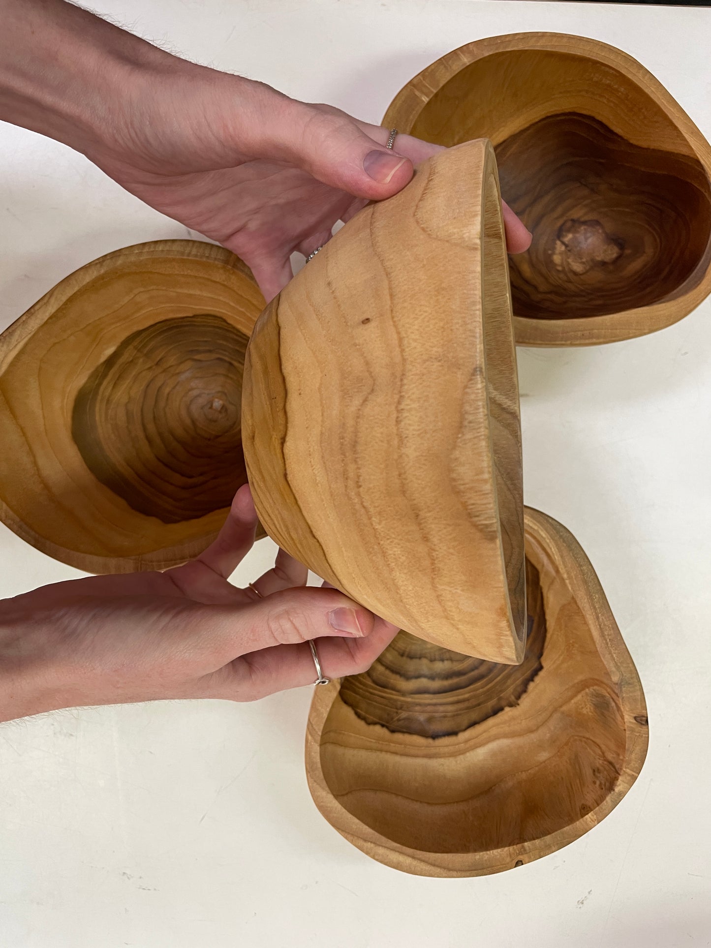 These wooden bowls are made from teak wood. They are unique and irregular shaped carved from one piece of wood and therefore aren't perfectly round. No two will ever be the same shape, size or marking.