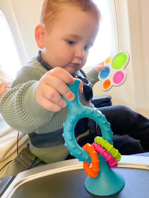 Flip and spin the textured, plastic rings to hear them rattle brightly. Press their suction cups onto any smooth, non-porous surface to set up a stationary play space and then pull them off to hear their loud and exciting POP.
