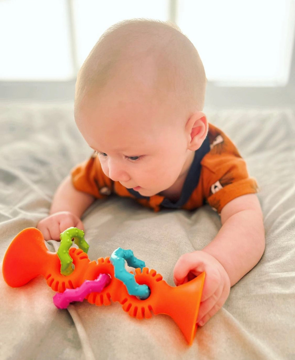 Their vivid textures instantly inspire little fingers to grab and feel while their soft silicone material simultaneously makes them perfect for soothing sore gums.