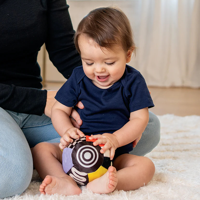 The Wimmer Sensory Ball is a vibrant and tactile toy that encourages exploration and motor skill development. It features bright colours, high-contrast graphics, and a variety of fabric textures to engage a baby's senses. The ball includes a gentle chime and crinkle sounds for auditory stimulation, while satin ribbons and embroidered details offer additional tactile experiences.