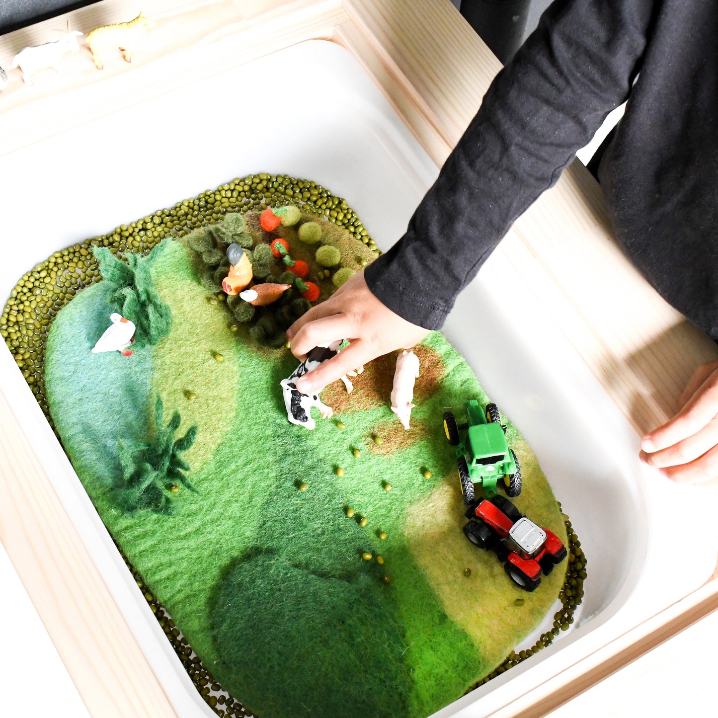 Create the perfect backdrop to an invitation to play, our felt playscapes works well with small animals. Designed by a mum to contain mess, our play mats also fits into an Ikea 'trofast' box and 'flisat' table.