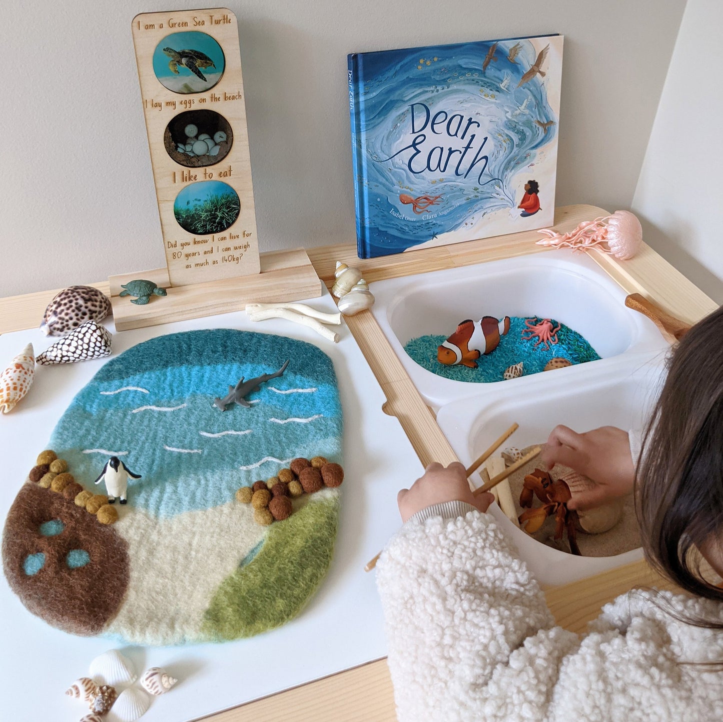 Create the perfect backdrop to an invitation to play, our felt playscapes works well with small animals. Designed by a mum to contain mess, our play mats also fits into an Ikea 'trofast' box and 'flisat' table.