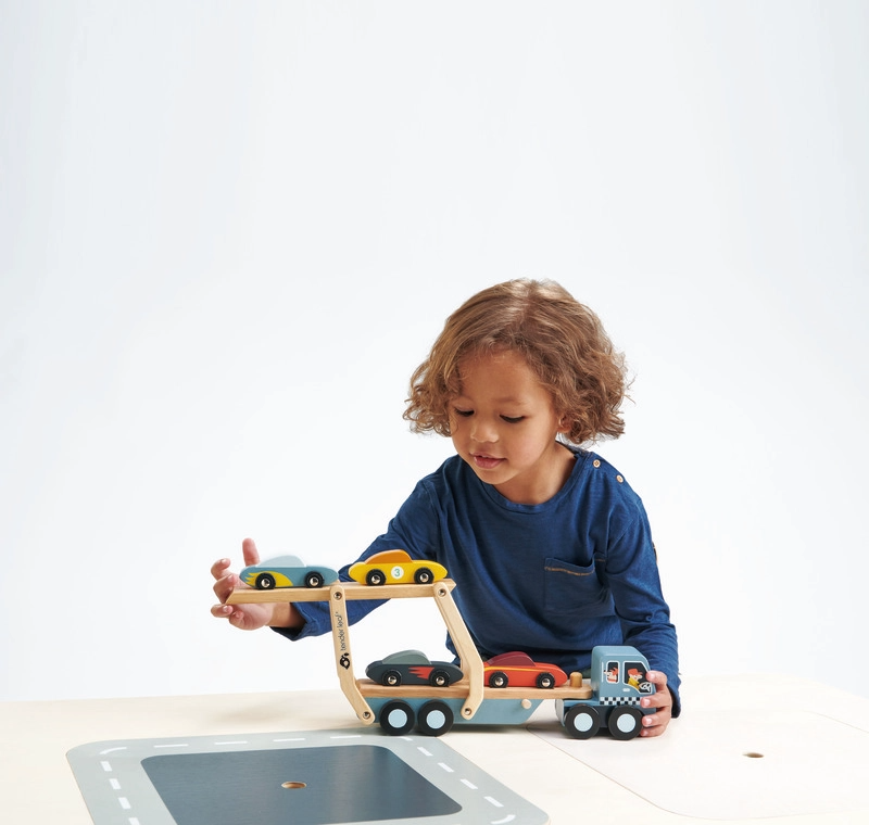 A stunning wooden retro car transporter truck with 4 wooden cars.