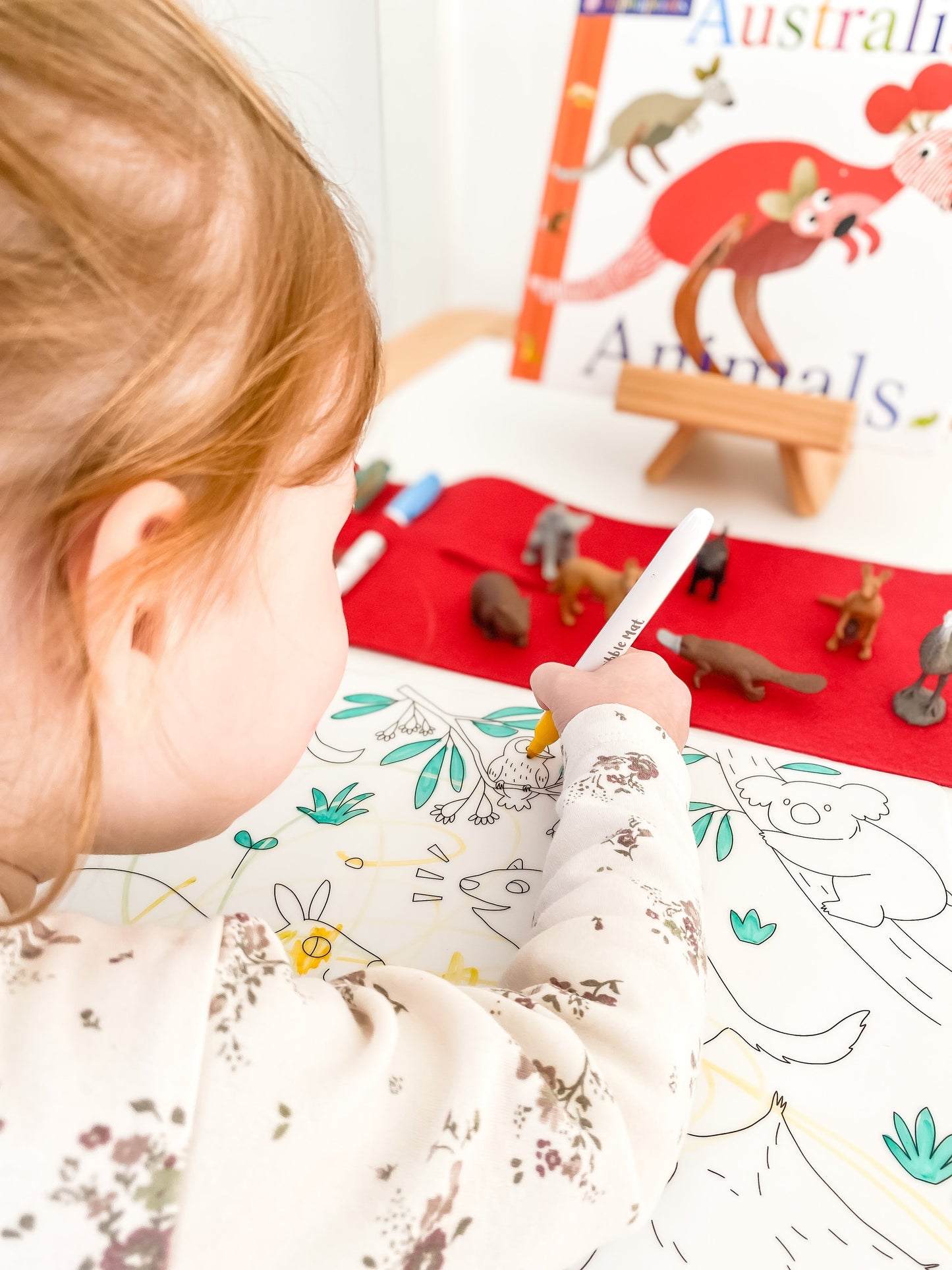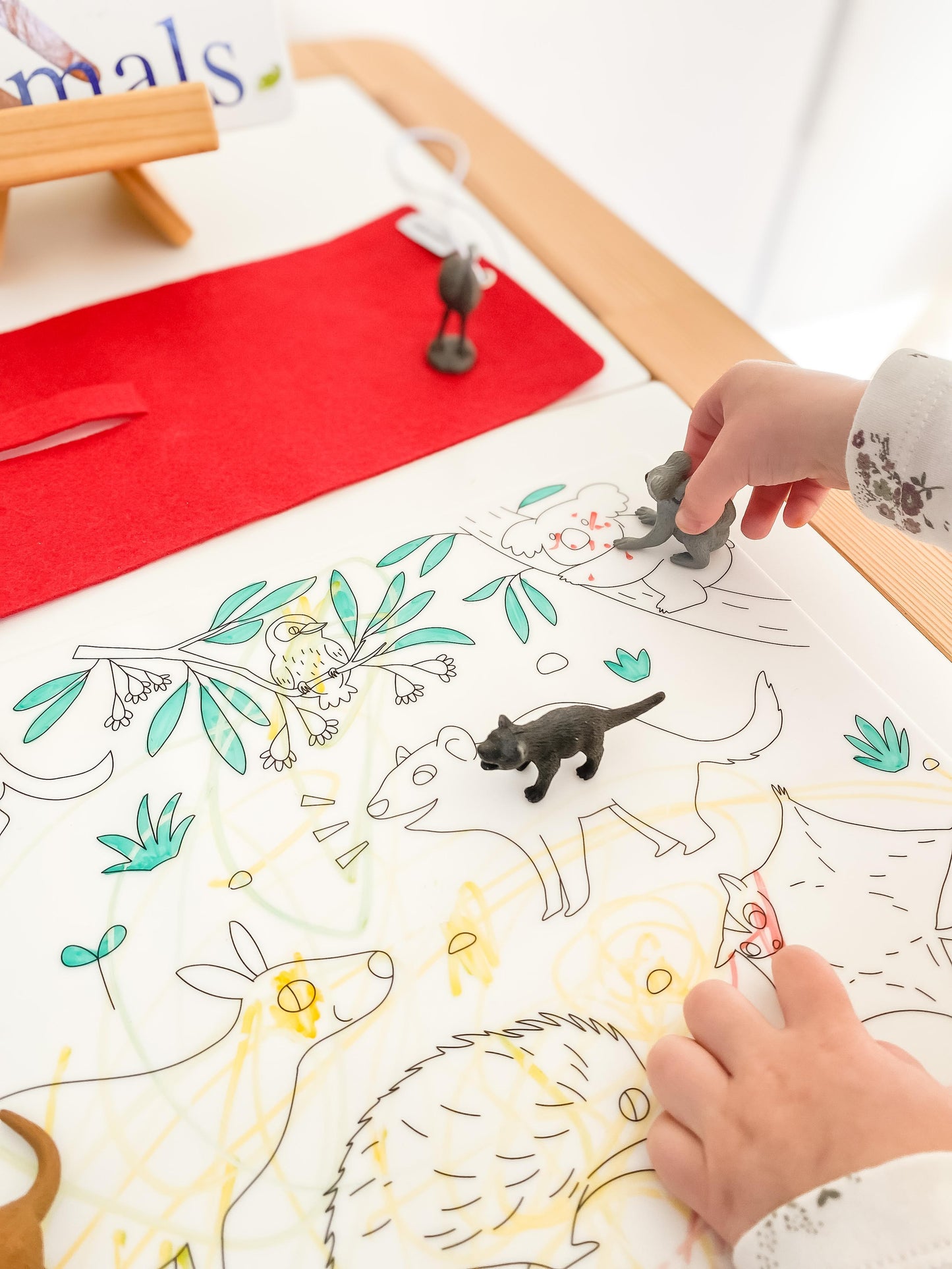Scribble and wipe clean. The mats wipe clean with a damp cloth or our custom cleaning cloth.